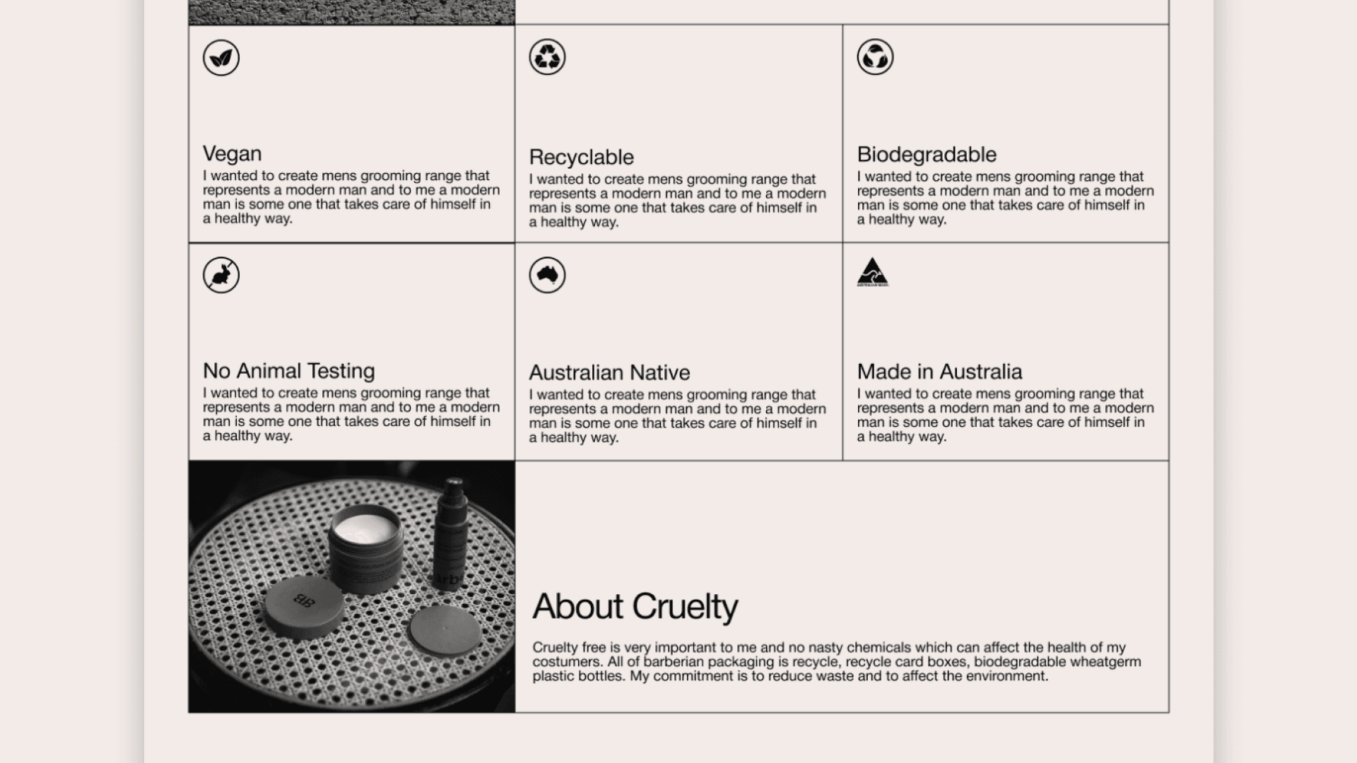 The design closely follows the established black, white, and beige brand palette, ensuring the website feels consistent with Barberian across packaging, print, and advertising.